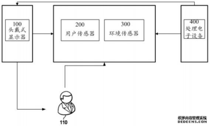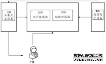 [0042] 具体地,环境传感器300,可以被配置为收集关于用户外部的参数的数据。可以检 测用户周围的世界的对象、刺激物、人、动物、位置或其它方面。比如,环境传感器30可以包 括一个或多个相机、高度计、气压计、化学传感器、湿度传感器、温度传感器、外部麦克风、光 传感器、定时装置(例如,时钟或日历),或其任何组合或子组合。又比如,环境传感300可以 被配置为测量环境的环境光。